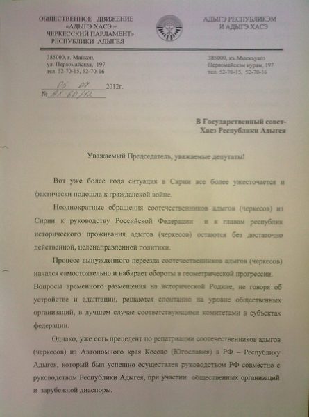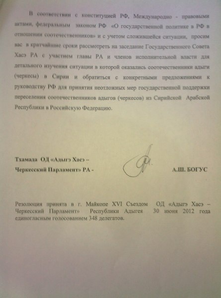 В соответствии с Конституцией РФ, международно-правовыми актами, федеральным законом РФ "О государственной политике в РФ в отношении соотечественников" и с учетом сложившейся ситуации, просим вас в кратчайшие сроки рассмотреть на заседание Государственного Совета Хасэ РА с участием главы РА и членов исполнительной власти для детального изучения ситуации, в которой оказались соотечественники адыги (черкесы) в Сирии, и обратиться с конкретными предложениями к руководству РФ для принятия неотложных мер государственной поддержки переселения соотечественников адыгов (черкесов) из Сирийской Арабской Республики в Российскую Федерацию.