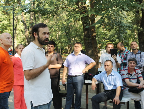 Акция "Белая лента" в Волгограде. Встреча жителей города с депутатом Госдумы Ильей Пономаревым. Слева - лидер инициативной группы "За хорошие дороги" Алексей Ульянов. 3 сентября 2012 г. Фото Вячеслава Ященко для "Кавказского узла" Вечером 3 сентября в Волгограде у здания регионального правительства Илья Пономарев также провел встречу. В акции приняли участие около 30 человек: активисты местных оппозиционных движений, члены партии "Яблоко", журналисты, обычные граждане.