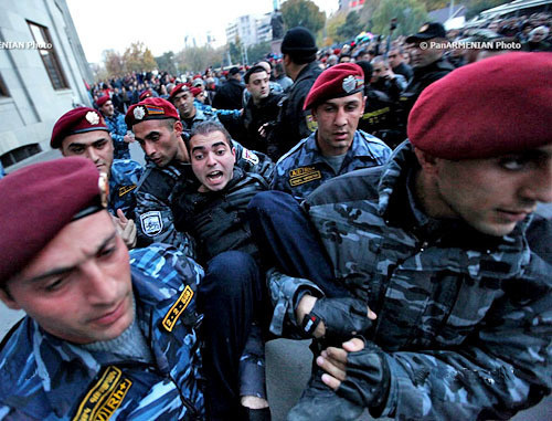 «Кавказский узел» сообщал, что во время протестной акции "Марш миллиона масок", прошедшей 5 ноября 2013 года в Ереване, были задержаны 37 человек. Участники марша вступили в противостояние с полицией. В ходе беспорядков пострадали восемь полицейских и подросток. 20 участников акции были арестованы. Им предъявлено обвинение в сопротивлении представителю власти, совершенном с применением насилия. 25 декабря голодовку протеста объявил лидер партии «Цегакрон» Шант Арутянюн, а 28 декабря – Липарит Петросян.