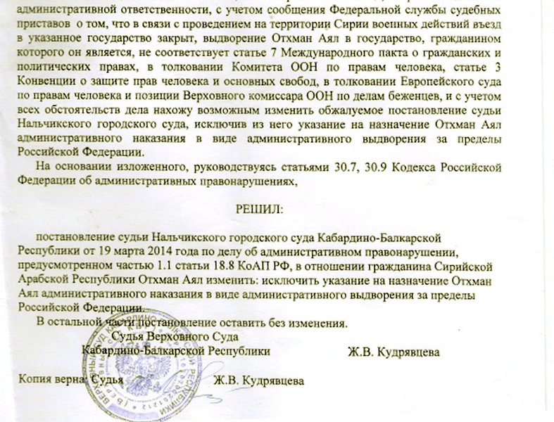 Верховный суд Кабардино-Балкарии сегодня частично удовлетворил жалобу гражданина Сирии, этнического черкеса Отхмана Аяла и отменил решение о его депортации, сообщил его адвокат Мухарби Карданов.