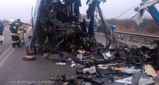 Как информировал "Кавказский узел", в Андроповском районе Ставрополья сегодня около 01.10 на 287-м километре трассы "Кавказ" произошло крупное ДТП. По предварительным данным ГИБДД, автобус выехал на встречную полосу, где столкнулся с грузовиком. Региональное УГИБДД ранее сообщило о трех погибших, число пострадавших не уточнялось.