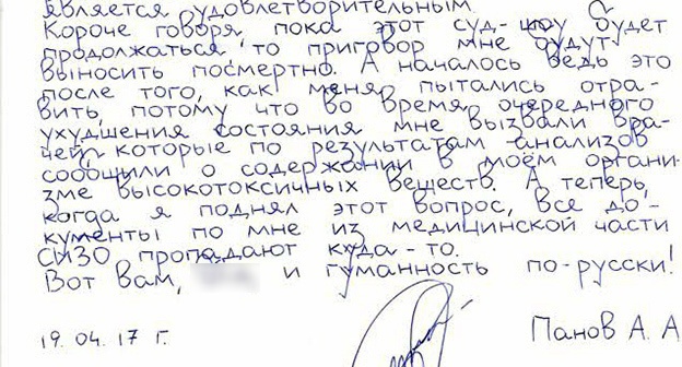 "Короче говоря, пока этот суд-шоу будет продолжаться, то приговор мне будут выносить посмертно. А началось ведь это после того, как меня пытались отравить, потому что во время очередного ухудшения состояния мне вызвали врачей, которые по результатам анализов сообщили о содержании в моем организме высокотоксичных веществ. А теперь, когда я поднял этот вопрос, все документы по мне из медицинской части СИЗО пропадают куда-то", – пишет Панов.