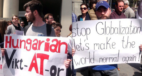 Акцию в поддержку Виктора Орбана организовали активисты политического движения "Грузинская сила". Один из участников акции держал в руках плакат: "Остановите глобализацию – это сделает мир снова нормальным".