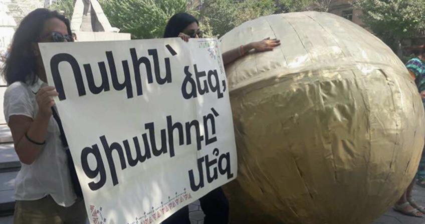 «Золото, которое можно добыть на Амулсарском месторождении, должно выглядеть по величине как этот шар. И ради этого золота правительство Армении дает разрешение на уничтожение нашей природы. Этот золотой шар полностью соответствует ценностям нашего правительства», - заявил участник акции корреспонденту «Кавказского узла».