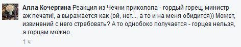 Пользователь Facebook под ником Алла Кочергина в комментарии к записи Артемия Лебедева отметил экспрессивность слов Джамбулата Умарова. "Реакция из Чечни приколола - гордый горец, министр аж печати!, а выражается как (ой, нет..., а то и на меня обидится)) Может, извинений с него стребовать? А то однобоко получается - горцев нельзя, а горцам можно", - написал пользователь.