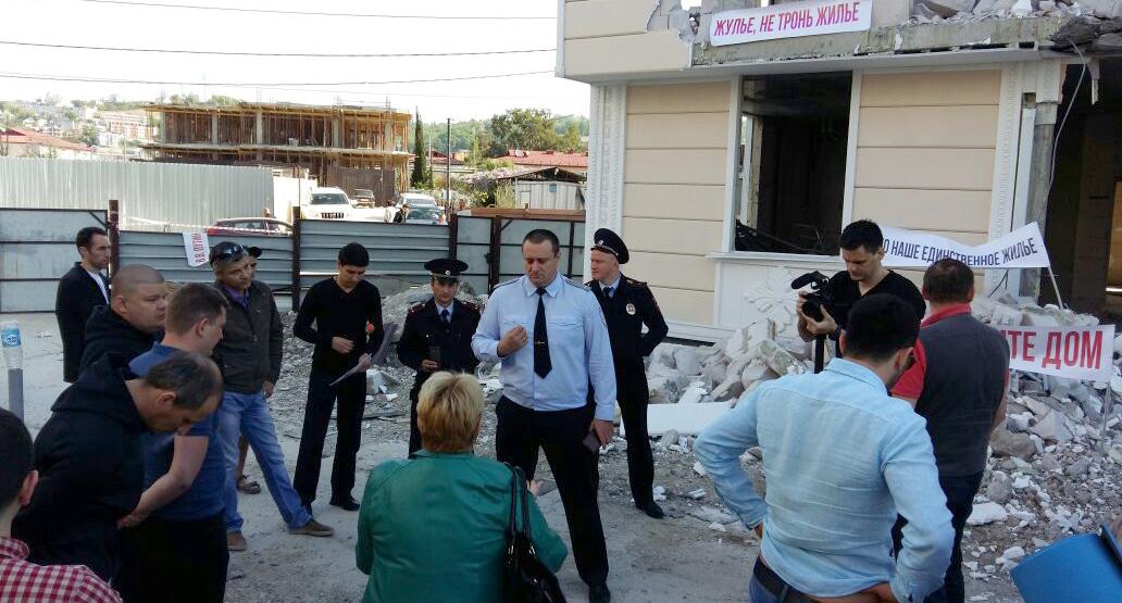 Около 30 человек собрались сегодня с плакатами у пятиэтажного дома в Сочи, который 9 апреля власти начали сносить по решению суда. Прибывшие на пикет мэр города и полицейские уговаривают участников акции разойтись.