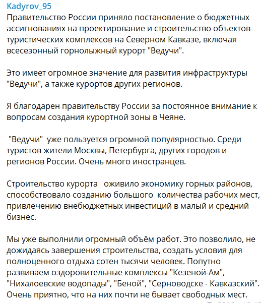 "Ведучи" уже пользуется огромной популярностью. Среди туристов - жители Москвы, Петербурга, других городов и регионов России. Очень много иностранцев. Строительство курорта оживило экономику горных районов, способствовало созданию большого количества рабочих мест, привлечению внебюджетных инвестиций в малый и средний бизнес", - говорится в сообщении, опубликованном сегодня в Telegram-канале Кадырова.