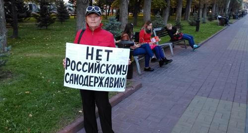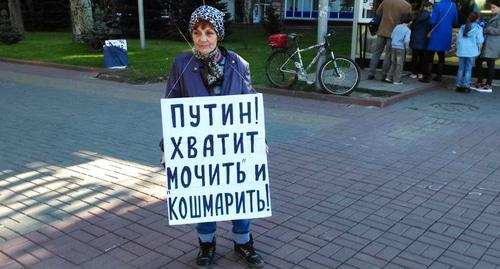Пикеты прошли сегодня с 14 до 16 часов на пересечении проспекта Ленина с Аллеей Героев. В акциях приняли участие Галина Тихенко, Владимир Васиковский, Владмир Тельпук, Галина Дорожнова, Любава Третьякова, Нина Шубина, Нина Штукатурова, Галина Заболотнева и Елена Шеина. Они держали плакаты "Свободу Олегу Сенцову!", "Путину – 66. Поздравляем! Уходи на пенсию!", а также с требованиями смены власти, передает корреспондент "Кавказского узла".