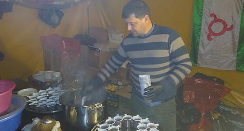 Перед зданием национальной телерадиокомпании "Ингушетия", где активисты проводят согласованный с властями митинг, создан палаточный городок, появились пункты питания.