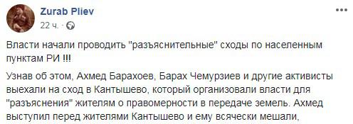 В числе активистов, которые приехали в Кантышево на сход, были Ахмед Барахоев, Барах Чемурзиев, сообщил на своей странице в Facebook Зураб Плиев, который также разместил несколько фрагментов видеозаписи схода в Кантышево. По словам Плиева, выступлению активистов пытались помешать.