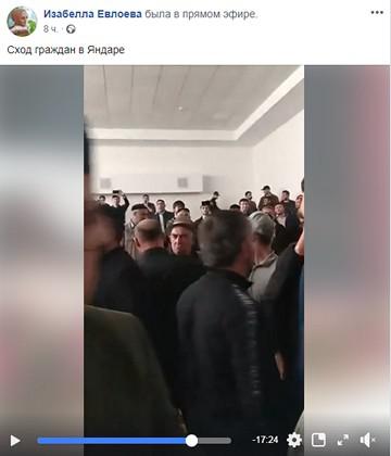 Изабелла Евлоева на своей странице в Facebook опубликовала видеозапись схода в Яндаре. На нем видно, как эмоционально проходит обсуждение. Выступают как люди, сидящие за столами на сцене, так и сидящие в зале, в основном все говорят на ингушском языке. В конце видео видно, что недовольные люди покидают Дом культуры.