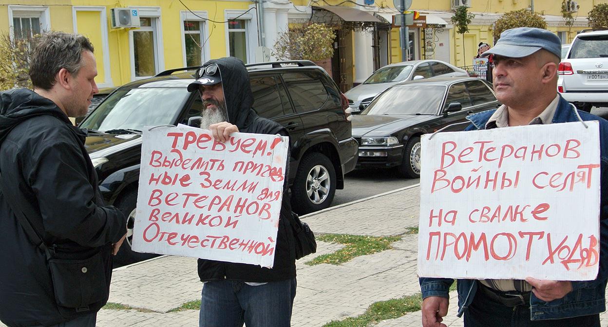 Четверо пикетчиков, сменяя друг друга, сегодня с 10:00 до 12:30 мск провели акцию протеста у знака "Нулевой километр" в центре Астрахани. В руках участники пикета держали плакаты: "Требуем! Выделить пригодные земли для ветеранов Великой Отечественной войны", "Ветеранов войны селят на свалке промотходов". Сотрудники полиции, зная о том, что пикетирование согласовано в администрации города, не мешали проведению акции, сообщил корреспонденту "Кавказского узла" организатор пикета Сергей Родионов.