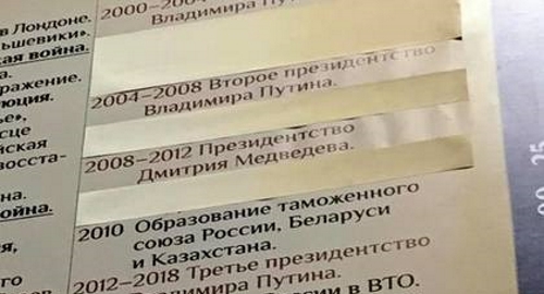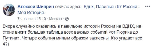 "Вчера случайно оказался в павильоне истории России на ВДНХ, на стене висит большая таблица всех важных событий "от Рюрика до Путина". Четыре события милым образом заклеены. Кто угадает все 4?" - написал он 8 января на своей странице в социальной сети Facebook.