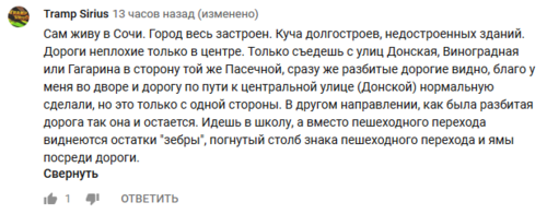 "Сам живу в Сочи. Город весь застроен. Куча долгостроев, недостроенных зданий. Дороги неплохие только в центре. Только съедешь с улиц Донская, Виноградная или Гагарина в сторону той же Пасечной, сразу же разбитые дороги видно", - написал пользователь под ником Tramp Sirius.
