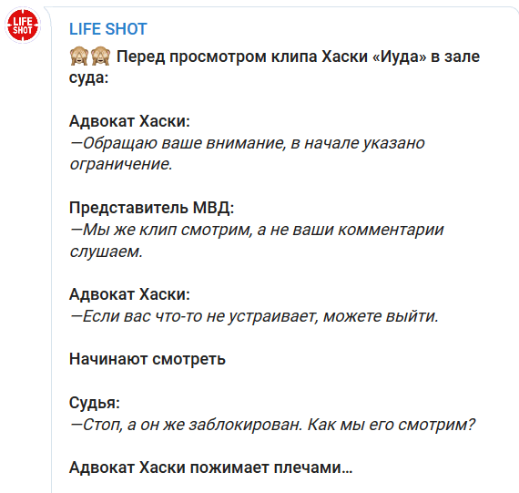 На сегодняшнем заседании суд решил просмотреть клип Хаски, открыв его на YouTube. Адвокат рэпера обратил внимание, что в начале клипа указано возрастное ограничение "18+". Начав просмотр, судья вспомнила, что ролик должен был быть заблокирован. "Стоп, а он же заблокирован. Как мы его смотрим?" - удивилась она.
