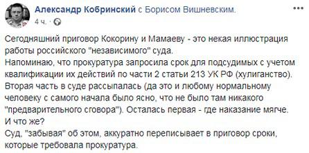 "Сегодняшний приговор Кокорину и Мамаеву - это некая иллюстрация работы российского "независимого" суда. Напоминаю, что прокуратура запросила срок для подсудимых с учетом квалификации их действий по части 2 статьи 213 УК РФ (хулиганство). Вторая часть в суде рассыпалась (да это и любому нормальному человеку с самого начала было ясно, что не было там никакого "предварительного сговора"). Осталась первая - где наказание мягче. И что же? Суд, "забывая" об этом, аккуратно переписывает в приговор сроки, которые требовала прокуратура", - написал на своей странице в Facebook Александр Кобринский.