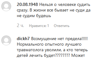 "Возмущению нет предела! Нормального опытного лучшего травматолога уволили, а кто теперь детей лечить будет? <...> Я звонила лично в Минздрав и выразила свое недовольство и теперь пишу письмо вышестоящим лицам, чтоб его вернули" – написала dickh7, пояснив, что, по ее мнению, уволенный врач – "лучший травматолог-ортопед, прекрасный человек и прекрасно ставит диагнозы".