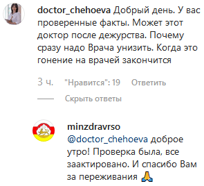 Пользователь doctor_chehoeva поинтересовался у пресс-службы Минздрава, проверен ли факт опьянения врача. "Может, этот доктор после дежурства. Почему сразу надо врача унизить? Когда это гонение на врачей закончится?" – написал он.