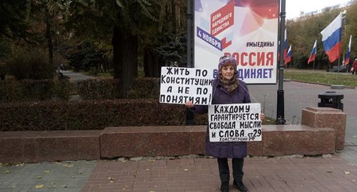 "Все законы, которые принимает правительство, в том числе пенсионная реформа, только ухудшают наше состояние, мы чувствуем себя незащищенными, - заявила корреспонденту "Кавказского узла" Ольга Карпухнова. – Я требую отмены антисоциальных законов, вернуть демократию. Что это такое – закрыли даже организацию "За права человека" (Верховный суд России ликвидировал организацию "За права человека" 1 ноября – прим. "Кавказского узла"). Наша свобода сжимается как шагреневая кожа. Я требую расширения демократических прав и свобод. О каком единстве может быть речь? Яхты и уличные клозеты без отопления никак не могут между собой объединиться".
