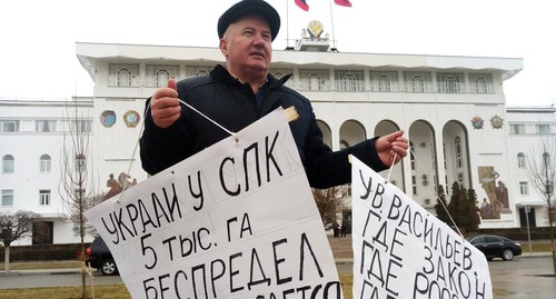 Сегодня председатель сельскохозяйственного кооператива (СПК) имени Юсупа Гаджакаева вышел на одиночный пикет на центральную площадь Махачкалы, к Дому правительства. С собой он принес два плаката. На одном из них он написал, что у СПК украли пять тысяч гектаров земли, а на другом обратился к главе Дагестана Владимиру Васильеву с вопросом "где борьба с коррупцией?", передал корреспондент "Кавказского узла".