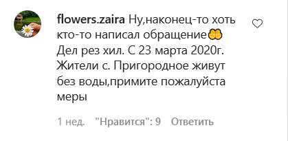 "Наконец-то хоть кто-то написал обращение. С 23 марта 2020 года жители с. Пригородное живут без воды, примите, пожалуйста, меры", - написала flowers.zaira. "Я давно хотела написать про эту проблему с водой в Пригородном", - добавила _zarema_albastova_.