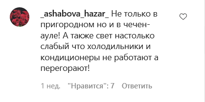 Некоторые комментаторы отмечают, что аналогичная проблема есть и в других населенных пунктах республики. "Не только в Пригородном, но и в Чечен-ауле", - написала _ashabova_hazar_. "В Чири-Юрте та же проблема", - утверждает mikhailova5734. "В поселке Долинский вечная проблема с водой", - добавил zali9515. "В Атагах тоже нет воды", - написала amishka___95_. "Проблема с водой у нас тоже, ст. Первомайская", - заметила kazalievazara. "Бердыкель тоже не остался в стороне. 2-3 месяца нет воды на нашей улице", - указал dadaev80. "В посёлке Старая Сунжа также уже месяца два, по крайней мере на нашей улице жалуются, по каплям набирают воду", - написала monata95.