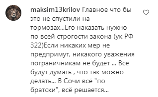 "Главное, что бы это не спустили на тормозах. Его наказать нужно по всей строгости закона (УК РФ ст. 322 ("Незаконное пересечение Государственной границы Российской Федерации", - прим. "Кавказского узла")). Если никаких мер не предпримут, никакого уважения пограничникам не будет", - считает maksim13krilov.