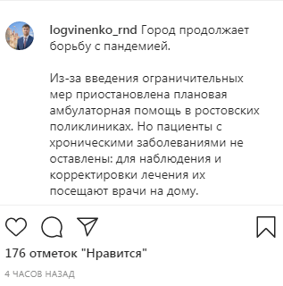 В связи с введением ограничений плановая амбулаторная помощь в поликлиниках приостановлена, сообщил сегодня глава администрации Ростова-на-Дону Алексей Логвиненко. "Пациенты с хроническими заболеваниями не оставлены: для наблюдения и корректировки лечения их посещают врачи на дому", - говорится в сообщении на его странице в Instagram.
