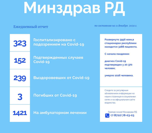 По состоянию на 11 декабря, в стационарах Дагестана находятся 3288 пациентов, госпитализированных с подозрением на COVID-19, еще 1421 человек находится на амбулаторном лечении, сообщило сегодня министерство здравоохранения республики на своей странице в Instagram. За последние сутки с симптомами COVID-19 госпитализировано 323 пациента. По данным Минздрава, в республике число коек для больных с внебольничной пневмонией увеличено на 200, всего для инфицированных COVID-19 в ковид-госпиталях выделено 3956 мест. В резерве остается менее 700 коек, пояснили в ведомстве.