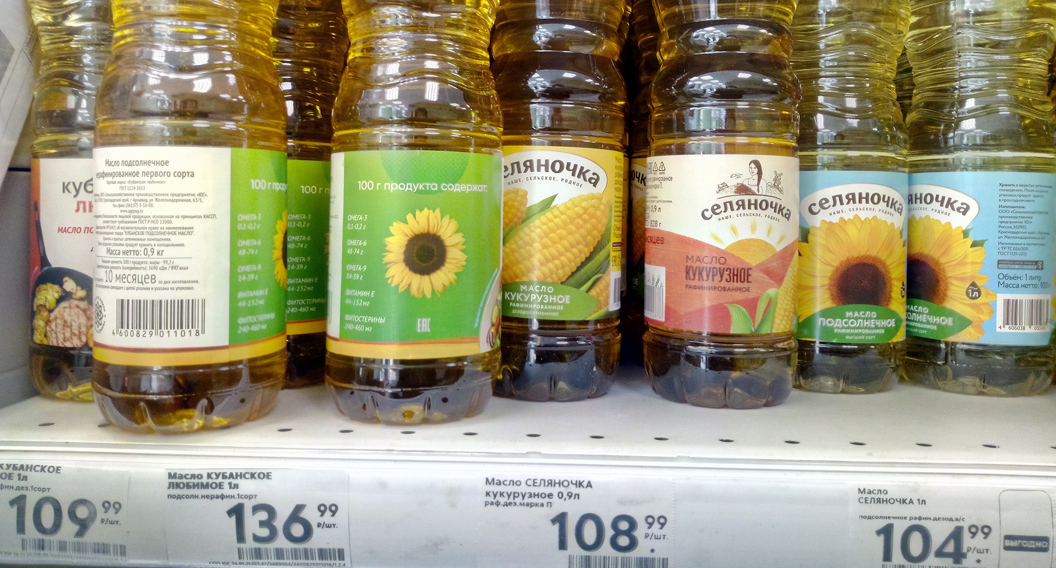 Так, в сетевом магазине "Магнит" килограммовая упаковка сахара стоит 43,99 рубля, а самая низкая цена на подсолнечное масло "Злато" Лабинского маслобойного завода - 103,99 рубля. Здесь продается также "Классическое" подсолнечное масло за 109,99 рубля, по такой же цене можно приобрести масло "Россиянка".