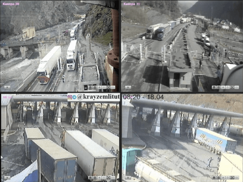 Согласно изображению с веб-камер на КПП "Верхний Ларс" на 08.20 мск, на въезде в Россию из Грузии наблюдается очередь из фур, конца которой не видно из-за поворота дороги, на КПП стоят три большегруза. На выезде из России также видна очередь из грузовиков, уходящая за поворот дороги. На самом КПП стоят две фуры. Данные веб-камер обновляются каждые пять минут, говорится в публикации на сайте "Край земли".