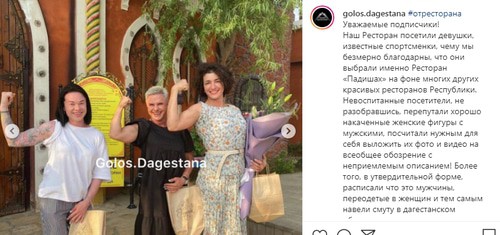 Фото этих же девушек, позирующих с бумажными пакетами и букетами цветов, размещено сегодня в Instagram-паблике "Голос Дагестана", на который подписан миллион подписчиков. В публикации приводятся пояснения от имени заведения. "Наш ресторан посетили девушки, известные спортсменки, чему мы безмерно благодарны... Невоспитанные посетители, не разобравшись, перепутали хорошо накаченные женские фигуры с мужскими, посчитали нужным для себя выложить их фото и видео на всеобщее обозрение с неприемлемым описанием! Более того, в утвердительной форме расписали, что это мужчины, переодетые в женщин, и тем самым навели смуту в дагестанском обществе. [...] Администрация ресторана «Падишах» от имени всех, кто писал гадости в адрес девушек, приносит извинения. Нам очень стыдно за некоторых дагестанцев и дагестанок! У нас таких очень мало, но, к сожалению, они есть, как и везде. С сегодняшнего дня и на всё время вашего пребывания в Дагестане за вами и вашими друзьями забронирован безлимитный подарочный стол", - говорится в публикации.