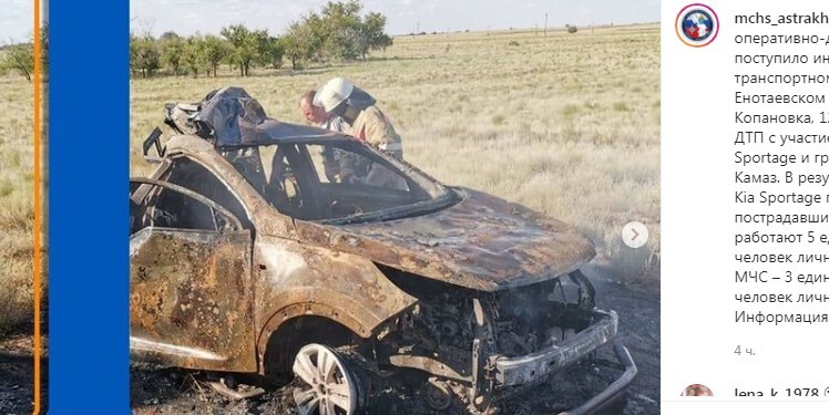 Авария произошла на трассе Р-22, в районе села Копановка Енотаевского района. В результате ДТП Kia Sportage полностью сгорел, сообщило РИА "Новости" со ссылкой на представителя регионального МЧС.
