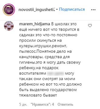 Запись о поборах в школах также была опубликована 10 сентября в Instagram-паблике novosti_ingushetii, на который подписано около 238 тысяч подписчиков. "Здравствуйте! Я бы хотел, чтобы хоть кто-то повлиял на [руководство одной из школ в Малгобеке]. Там каждый день почти просят деньги за разные вещи. То кулер под воду по 2000 рублей, теперь вешалки для детей по 350 рублей. У нас пятеро детей, мы и так в долги влезли. <…> Только девятый учебный день начался, а поборы пошли. <…> Неужели в республики нету денег, куда смотрят наши чиновники?" – приведены в описании публикации слова одного из подписчиков.