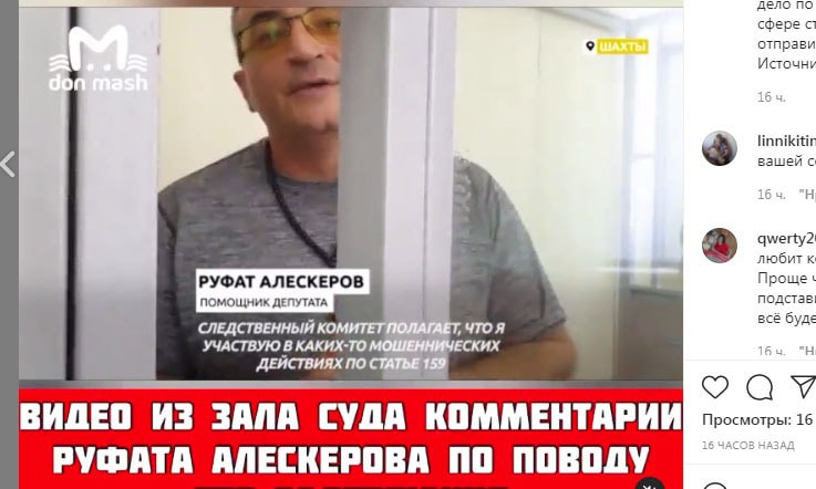 О задержании Алескерова также сообщил 8 сентября Instagram-паблик shahtystop, на который подписано около 33,8 тысячи пользователей. На кадрах ролика показан Руфат Алескеров, который заявил, что решение суда о его аресте для него предсказуемо. "Они решили, что, если я сдаю машины в аренду, и они участвуют в каких-то ДТП, и если там кто-то был получателем каких-то денежных средств – они считают, что я именно там и присутствовал", – заявил он на видео.