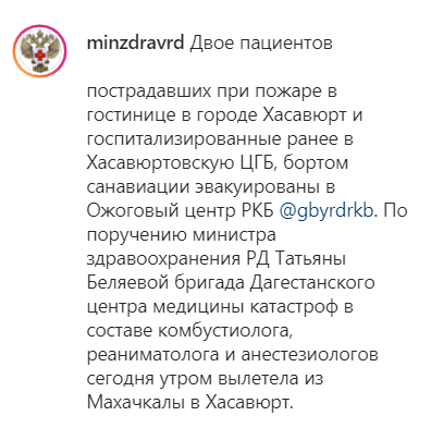 Крайне тяжелое состояние еще одного пострадавшего с ожогом 100% поверхности тела не позволило транспортировать его из медучреждения, он продолжил лечение в хасавюртовской больнице, говорится в сообщении министерства.