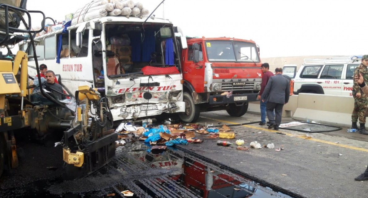 По предварительным данным, пассажирский рейсовый автобус столкнулся с асфальтоукладчиком и грузовым автомобилем, пишет day.az.