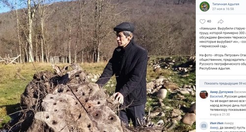 Четыре груши и две яблони возрастом около 300 лет вырублены в поселке Хамышки, это остатки черкесских садов, сообщил глава Русского географического общества в Адыгее Игорь Огай. Черкесские лесосады и растущие в них плодовые деревья уникальны, их необходимо сохранить, заявили ученые.