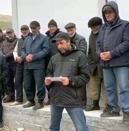 Житель села Куруш зачитывает обращение к президенту России Владимиру Путину. Стопкадр из видео https://www.instagram.com/p/CrUD-yzseuJ/На кадрах ролика он стоит на улице в окружении еще нескольких десятков жителей села. Сельчанин уточнил, что обращение к Путину также подписали родители военнослужащих, которые участвуют в спецоперации на Украине. Некоторые из сельчан держат в руках плакаты, на которых высказываются претензии к властям за передачу земель.
