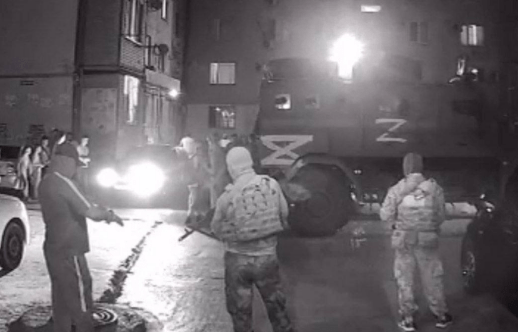 RusNews опубликовало фото, на котором во дворе жилого дома стоят трое силовиков с оружием и спецтехника. Вдали видна группа людей в гражданской одежде.