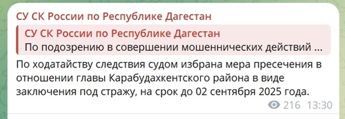 В телеграм-канале главы Карабудахкентского района последняя публикация от имени Махмуда Амиралиева датирована 15 июня. Публикация от 28 июня с поздравлением по случаю Дня молодежи уже подписана врио главы администрации района Джалалутдином Джамалутдиновым.