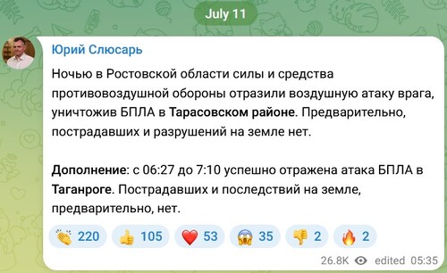 В свою очередь Юрий Слюсарь в 07.35 мск дополнил свою публикацию, сообщив, что "с 06.27 до 07.10 успешно отражена атака БПЛА в Таганроге".