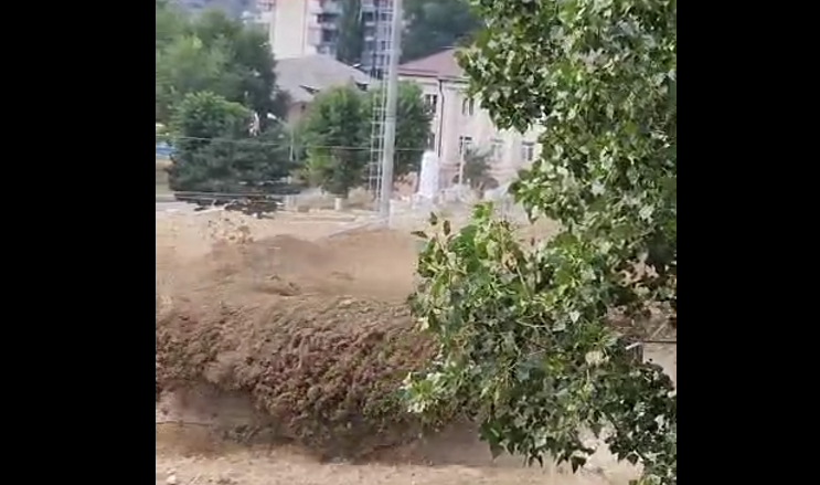 В полдень в Тырныаузе стало темно, потом раздалась сирена тревоги, после чего на город обрушился мощный селевой поток. Он перекрыл дорогу, снес газовую трубу, повредил электрические столбы. Часть города остается без света, газа и воды, рассказали корреспонденту "Кавказского узла" местные жители.