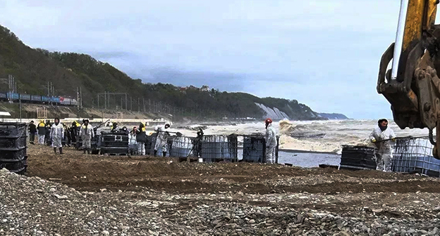 "Поднялась вода в реке Туапсе – произошел перелив нефтепродуктов через ранее выставленные боновые заграждения. В русле реки, ниже по течению, организовали сбор нефтепродуктов, которые частично попали в акваторию моря, а также на береговую линию", - говорится в сообщении.