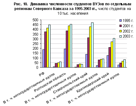 Рис. 10. Динамика численности студентов вузов по отдельным регионам Северного Кавказа за 1995–2003 гг.