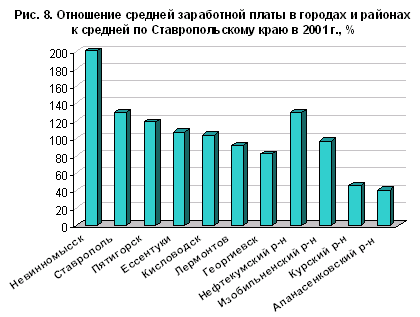Рис. 8. Отношение средней заработной платы в городах и районах к средней по Ставропольскому краю в 2001 г.
