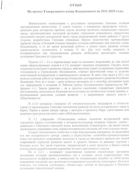 Раздобыл очень интересный документ - "Отзыв на проект Генерального плана Владикавказа на 2011-2025 годы". Автор - В.Л. Глазычев, заведующий кафедрой управления территориальным развитием Российской ...