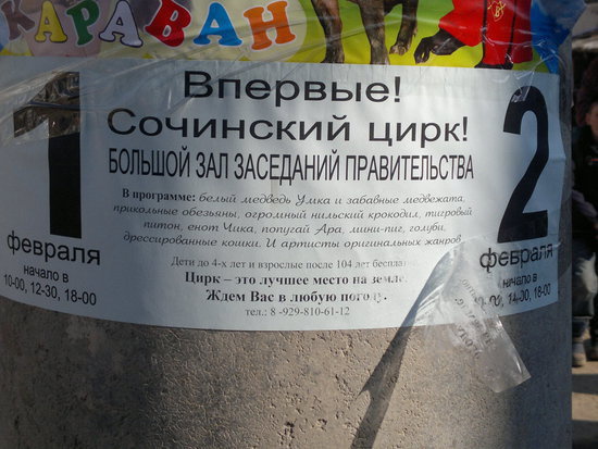 прислали пару фотографий из Цхинвала. Гастроли сочинского цирка в Южной Осетии. В программе Белый медведь умка и маленькие медвежата. Приходите все в большой зал заседаний правительства.