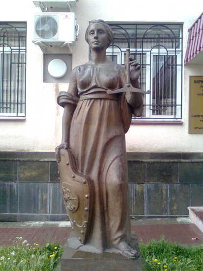 Поразительная статуя украшает здание Верховного суда Северной Осетии. Это Фемида с лицом сельской простушки, почему-то без повязки на лице и почему-то со щитом вместо меча. Да еще и весы кто-то "ув...