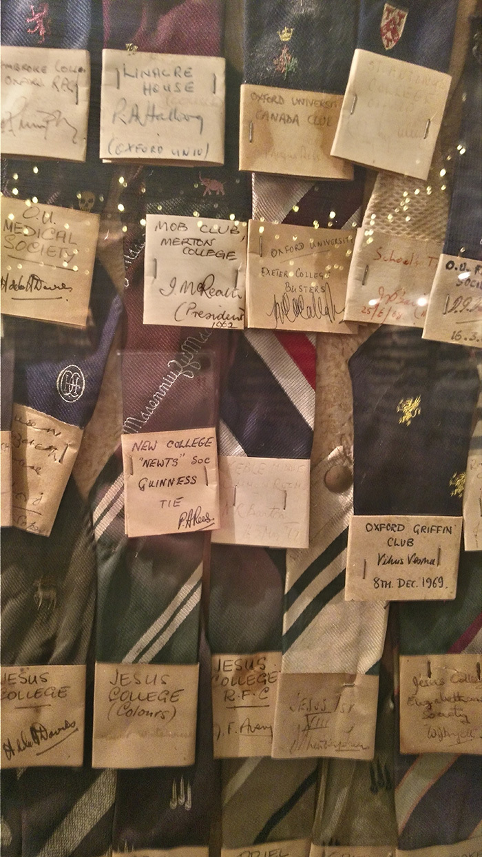 более оригинально был оформлен The Bear, который считается старейшим в Оксфорде и датируется 1242-м годом. все стены в студенческих галстуках, которые студенты по традиции отрезают в день выпуска. все галстуки содержат информацию о его владельце, названии колледжа и годе выпуска. можно найти очень старые...
